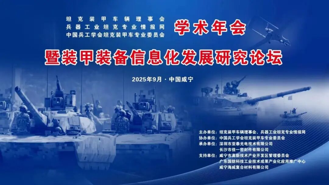 由坦克裝甲車輛理事會、兵器工業坦克專業情報網主辦,深圳市亞泰光電技術有限公司承辦的"2025年坦克裝甲車輛學術年會暨裝甲裝備信息化發展研究論壇"將于9月17日至19日在湖北咸寧華信大酒店隆重舉行。
