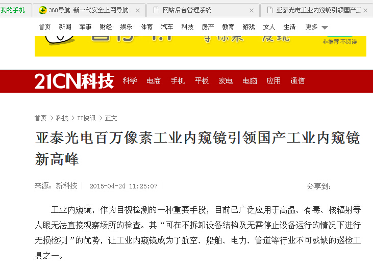 為改變這種局面,作為“國(guó)家高新技術(shù)企業(yè)”的深圳市亞泰光電技術(shù)有限公司,自2009年開(kāi)始著手對(duì)工業(yè)內(nèi)窺鏡的研發(fā)工作,成立了光學(xué)事業(yè)部并特別聘請(qǐng)了深圳大學(xué)牛憨笨院士作為技術(shù)顧問(wèn),經(jīng)過(guò)不懈的專(zhuān)研與努力,亞泰光電公司不僅擁有了自己的工業(yè)內(nèi)窺鏡產(chǎn)品,并先后獲得了5項(xiàng)工業(yè)內(nèi)窺鏡方面的發(fā)明專(zhuān)利。近日,由亞泰光電自主研發(fā)的“百萬(wàn)級(jí)像素”的超清視頻內(nèi)窺鏡已成功問(wèn)世,選用國(guó)產(chǎn)自主研發(fā)高端產(chǎn)品不再是夢(mèng)。