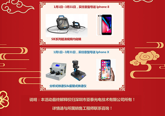 在過去的一年里,在亞泰人的共同努力下,我們取得了更大的成績,亞泰光電百萬像素內窺鏡在國內外市場進一步拓展,經銷商簽約量屢創新高,產品得到了國內外市場的認可和客戶一致好評;油液事業部的油液監測項目和眾多大型企業、高校有了更深入的合作,客戶的滿意是對亞泰人最好的獎勵,新年伊始,為回饋新老客戶對亞泰光電多年來的支持,亞泰光電新春送福送紅包,購儀器享豪禮!我們相信在亞泰人共同努力下,亞泰光電2018更上一層樓,亞泰光電愿與您一起共同攜手,共贏、共榮、共發展!