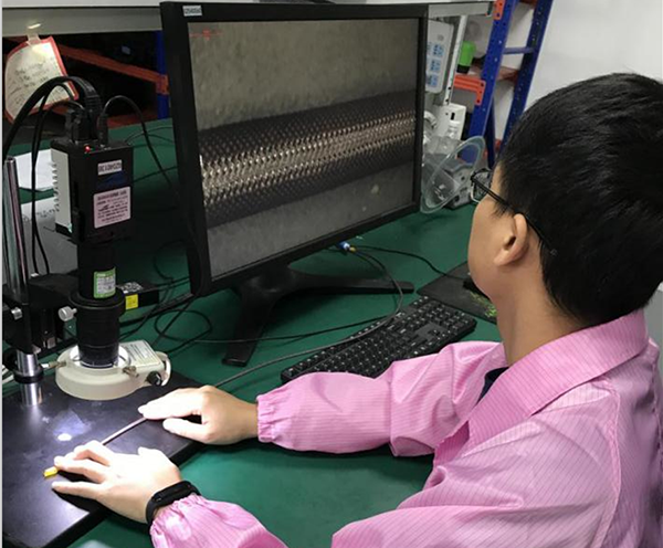 質量部檢驗員細致地檢驗鎢絲網套來料