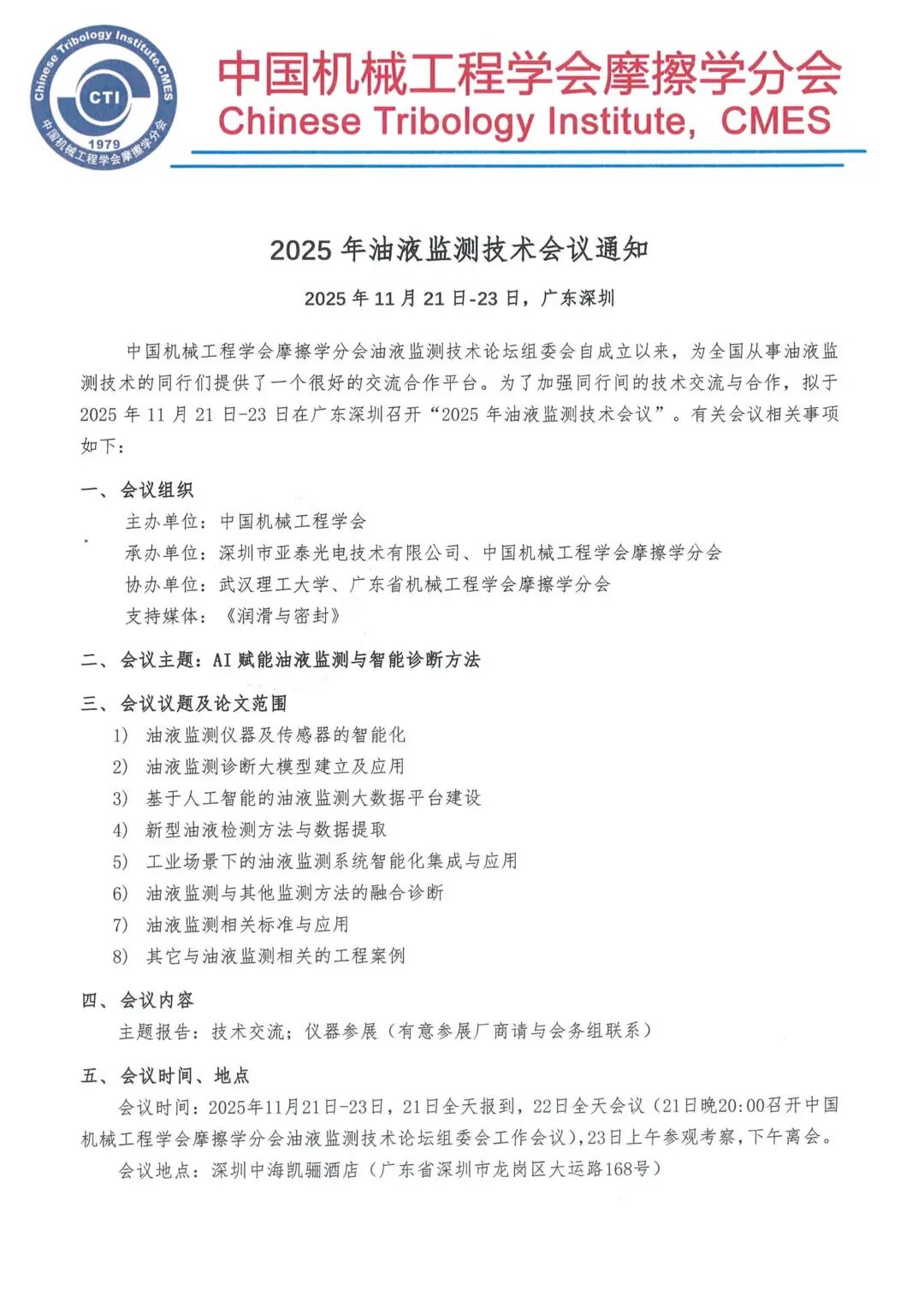 “2025年油液監測技術會議”將于2025年11月21日-23日在廣東·深圳中海凱驪大酒店隆重召開 。本次大會由中國機械工程學會主辦,深圳市亞泰光電技術有限公司與中國機械工程學會摩擦學分會共同承辦,將以“AI賦能油液監測與智能診斷方法”為主題,攜手業界精英,共繪智能運維的新藍圖。